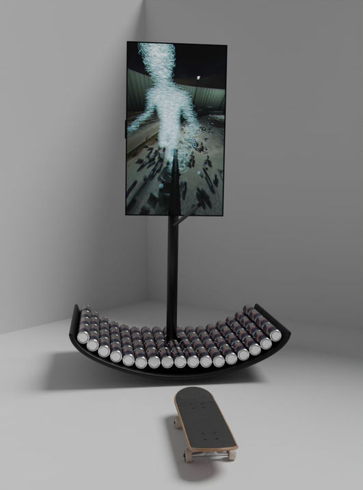 本次展覽如同一場既親密又公共的實驗,三位創作者從不同媒介出發:林恩崙的雕塑將公共空間中的障礙物彎曲、重複與變形,鬆動人們習以為常的規範邏輯;曹恆誠的影像作品透過個人形象與體感的塑造,開展對觀看方式與空間經驗的探索;蘇煌盛的繪畫則以跳躍、騰空與視角轉換,隱喻身體在運動中所經歷的敏銳變化與心理狀態。滑板經驗為我們提供了一種不同於日常的理解方 式,如同創作以各種別於以往的表現力來辨識自身、形塑認同與發現價值。展覽本身宛如一個非線性的時間裝置,藉由時間回返、空間錯置、身體感知與感性的相互支持來維繫彼此的連結。它從一次次深夜的練板談話而來,擴展到當代都市社會中的共同生存經驗,作品所呈現的不僅是三位創作者的個人軌跡,更是整個世代在城市縫隙中留下的時空印記。